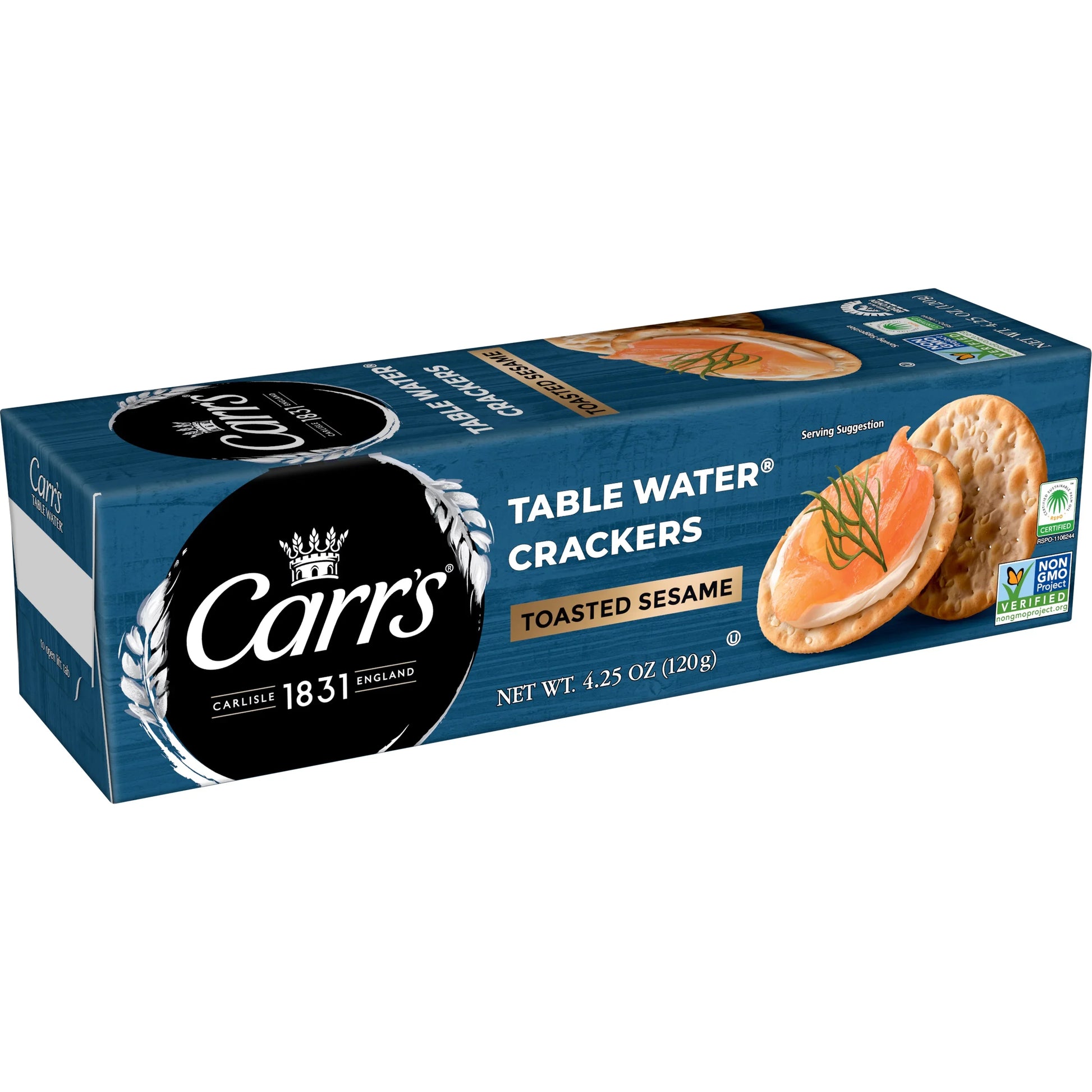 Lightly baked sesame seeds give Carr's® Table Water® Toasted Sesame crackers a buttery, slightly sweet taste that pairs beautifully with fruits and fruit-based spreads, especially those featuring raspberries, black berries, blueberries and strawberries.